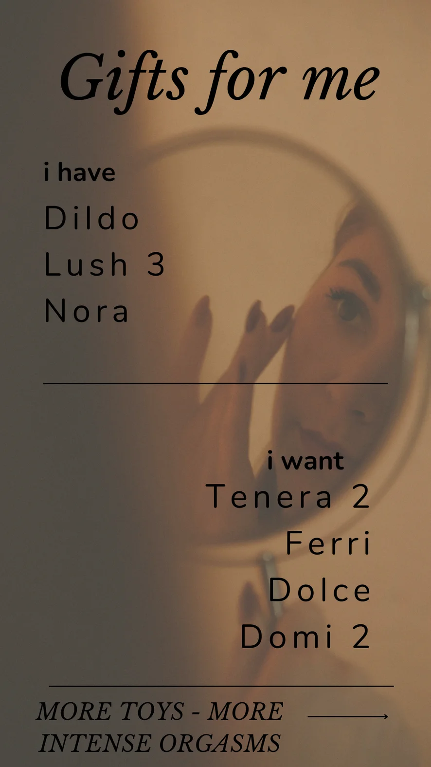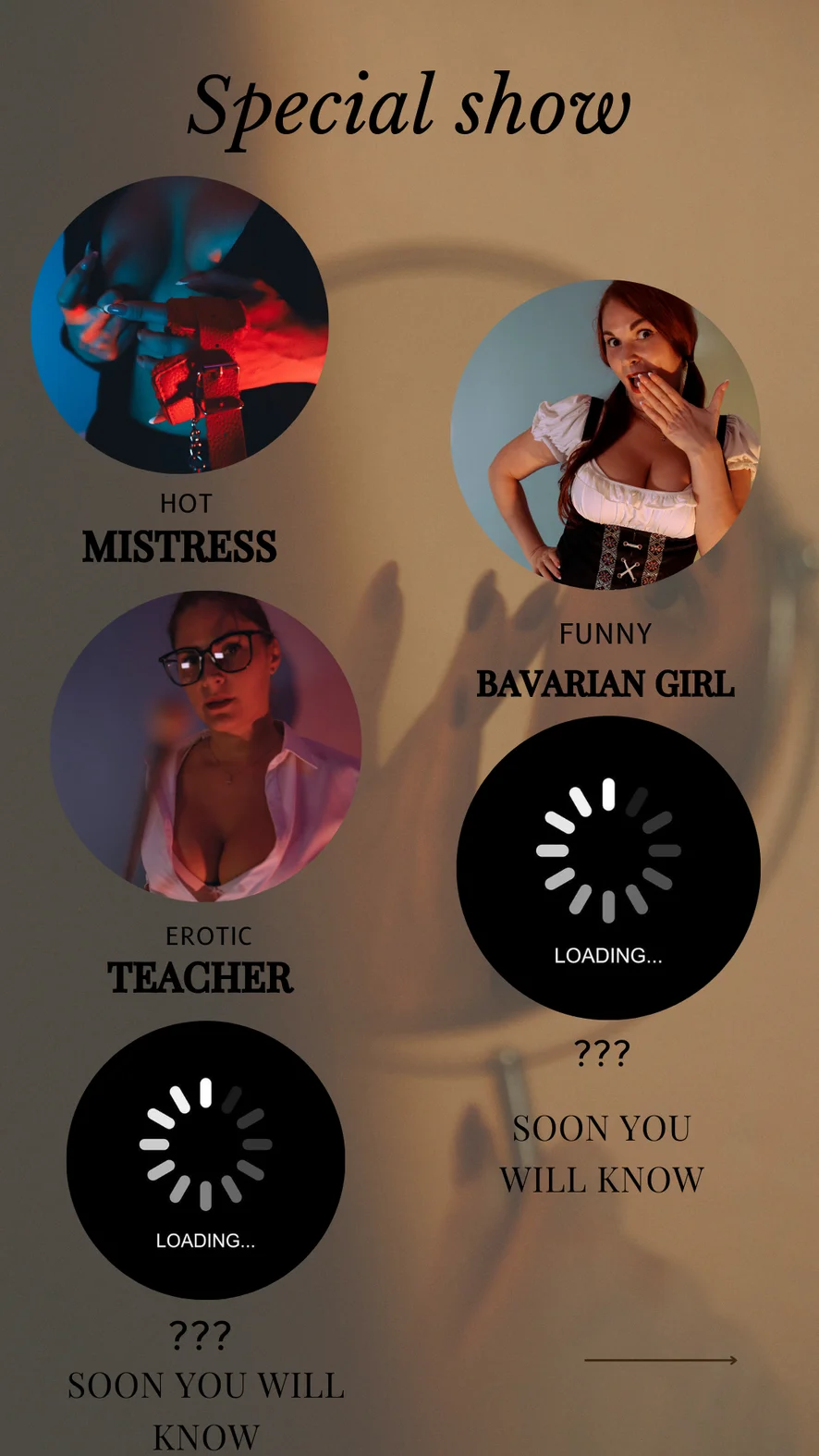 ตีก้น, ออฟฟิศ, วับๆ แวมๆ, นายหญิง, ส้นสูง, ไนลอน, เฟติชเท้า, ชุดลาเท็กซ์, คอร์เซ็ต, เต้นยั่ว, ใช้หน้าอก, ทำให้อับอาย, โชว์ใต้กระโปรง, สูบบุหรี่, ชุดหนัง, การให้คะแนนเจ้าโลก, เล่นชู้, โบลว์จ๊อบ, ใช้มือ, นั่งทับหน้า, แนะนำการช่วยตัวเอง, เซ็กส์ทอย, คุยเรื่องลามก, โชว์น้ำมัน, ถึงจุดสุดยอด, โรลเพลย์, สแตรปออน, ใช้นิ้ว, ดิลโด้หรือไวเบรเตอร์, คาวเกิร์ล, เปลือยอก, ท่าหมา, ระบำเปลื้องผ้า, เพ็กกิ้ง